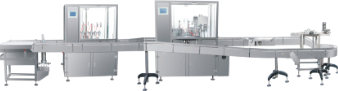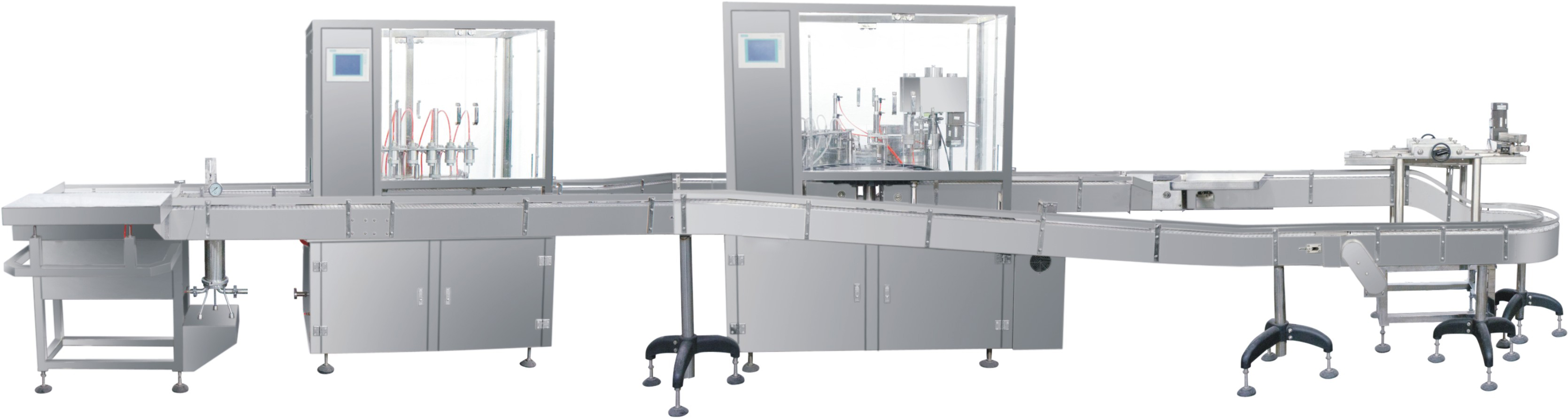 该生产联动线是由自动推瓶机、气洗机、灌装旋盖机、脱瓶托机、自动剔瓶机、环形输送带组成,该机性能稳定,操作简单方便,深受用户的青睐。